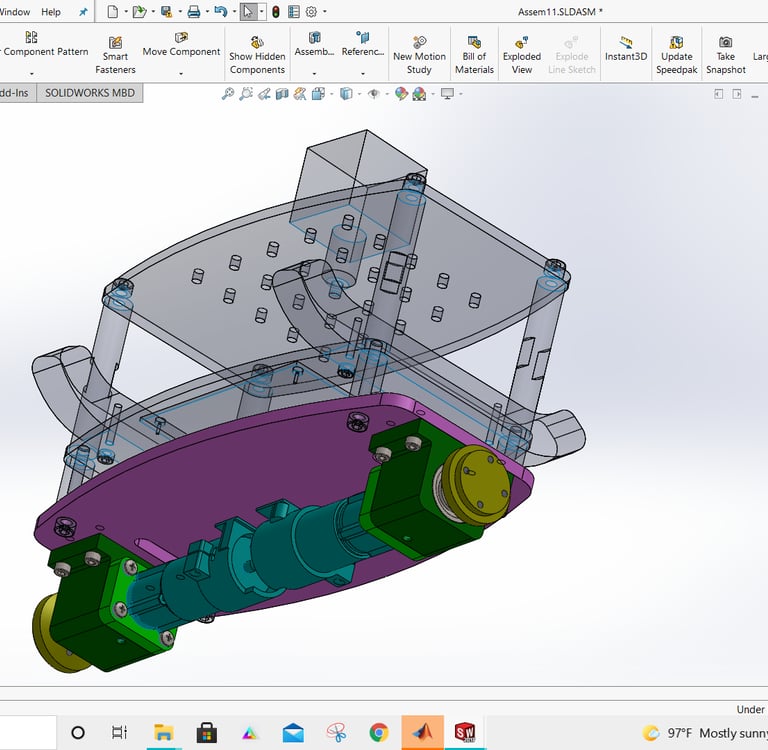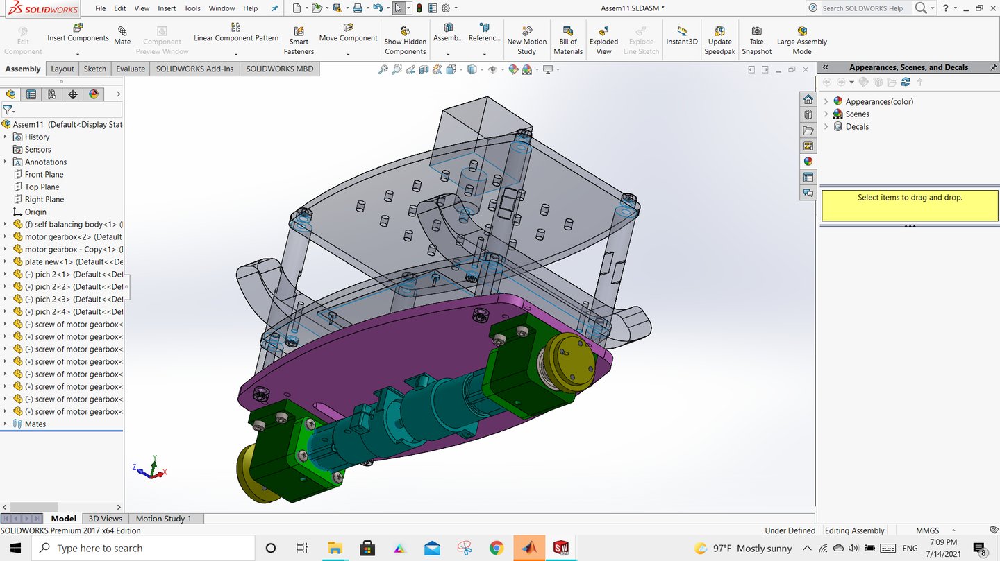 Designed and analyzed a two-wheeled self-balancing robot, focusing on system dynamics, stability, and control. The project involved full 3D modeling and simulation to evaluate real-time balancing behavior. It demonstrated strong integration of mechanical design with control principles in robotics.