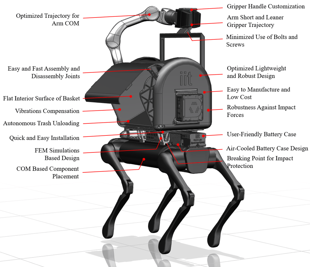 The final system successfully demonstrates a novel approach to integrating mechanical design with legged robotics for environmental applications. Real-world testing confirmed seamless interaction between the robot, arm, and container, validating both the design methodology and system performance .