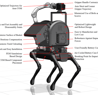 I designed and developed a fully functional container mechanism for autonomous trash collection on a quadruped robot, addressing the challenges of operating in unstructured environments such as beaches, stairs, and rocky terrain.