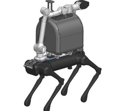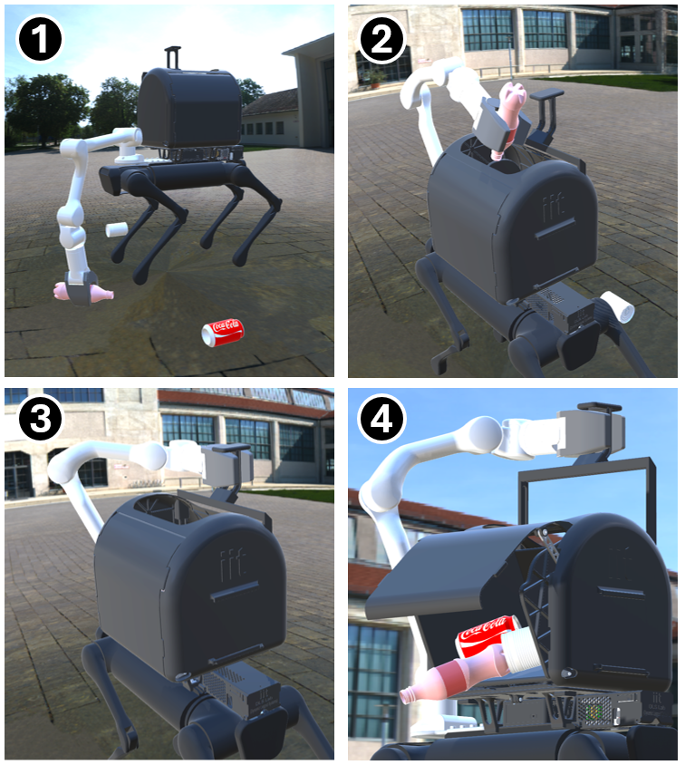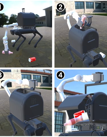 The system integrates three main components: a quadruped robot (Unitree AlienGo), a robotic arm (Unitree Z1), and a custom-designed container mechanism. The goal was to enable a fully autonomous cycle of detecting, collecting, storing, and unloading trash in challenging environments.